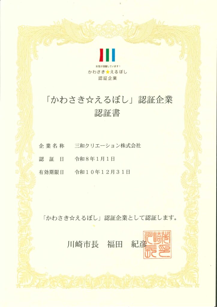 令和7年度「かわさき☆えるぼし」認証企業に認定されました